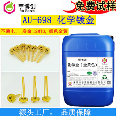 1、第一浸金槽(含Au 0.5 g/L):于3.5升去離子水中加入1升YBC-680—A開缸液和25毫升金鹽溶液(含Au 100 g/L),攪勻,若有必要用YBC-680—B pH調節(jié)液或10 % KOH調節(jié)pH值在4.0–4.6。加去離子水至總體積為5升,攪勻。按上述比例配制所需體積的工作液。